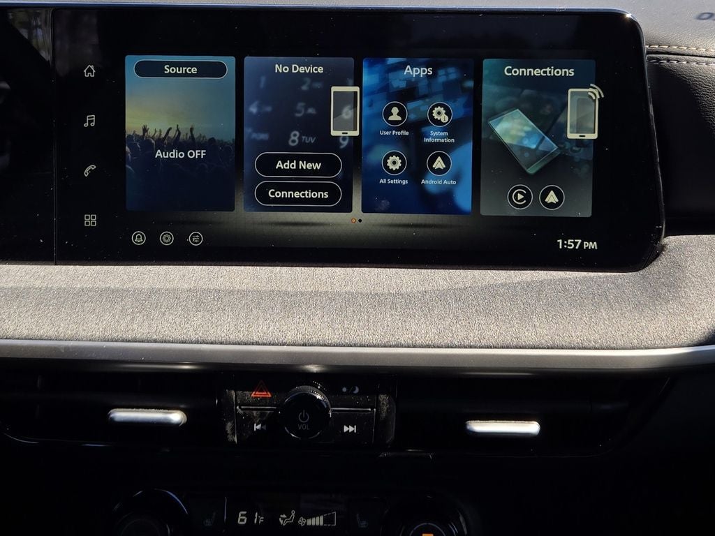 - Radio: AM/FM/SiriusXM Audio System -inc: 12.3" color touchscreen display w/4 speakers, Bluetooth® hands-free phone system, streaming audio via Bluetooth®, NissanConnect featuring wireless Apple CarPlay, wireless Android Auto, Siri eyes free and hands-free text messaging assistant, audio and Bluetooth® steering wheel switches