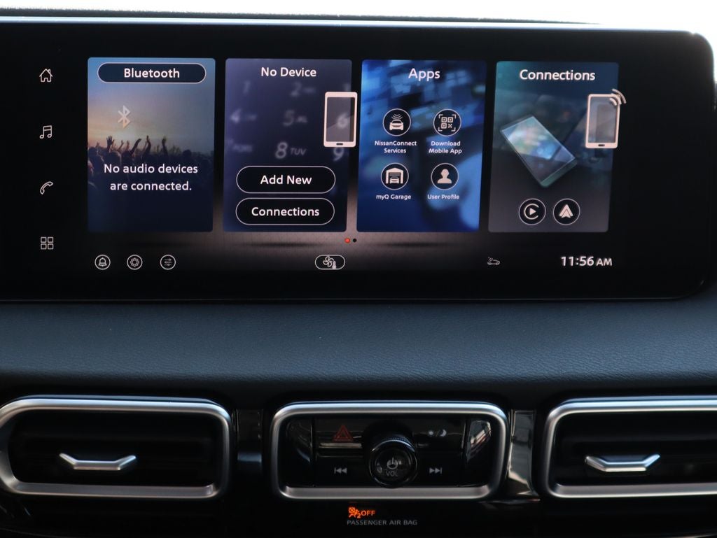 - Radio: AM/FM w/RDS/MP3 -inc: 6 speakers, 12.3" NissanConnect multimedia center display, Bluetooth® hands-free phone system, streaming audio via Bluetooth®, hands-free text messaging assistant, Siri Eyes Free, Google Assistant voice recognition, wireless Apple CarPlay and Android Auto, NissanConnect services, Wi-Fi hotspot, Over-The-Air (OTA) updating for headunit firmware via Wi-Fi WPA2 connection and (2) front USB connection port (type C)